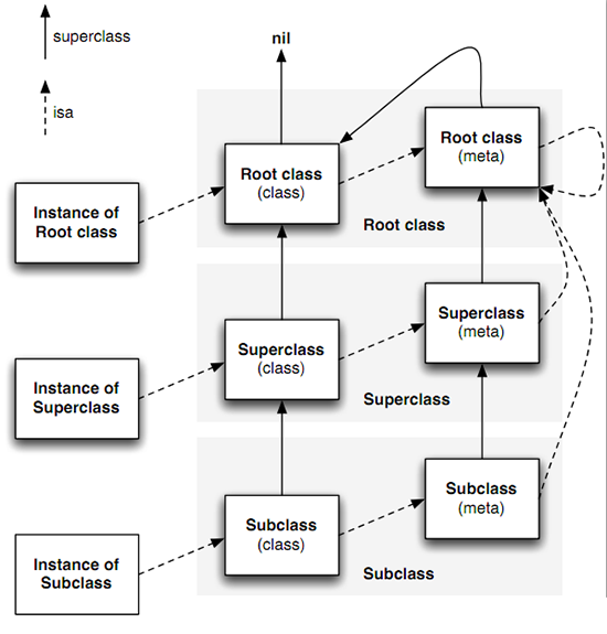 metaclass 的 isa 指向根 metaclass,如果该 metaclass 是根 metaclass则指向自身;