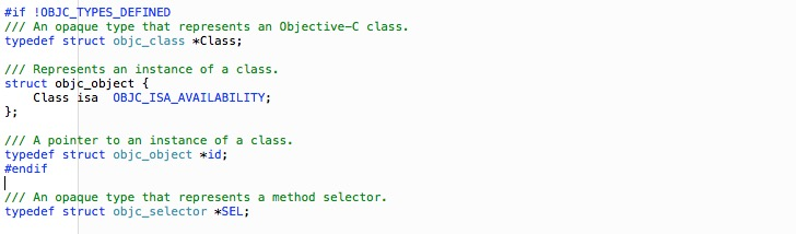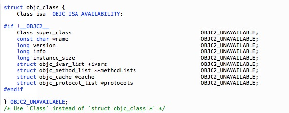 那么什么是类呢?在xcode中用快捷键Shift+Cmd+O 打开文件objc.h 能看到类的定义: