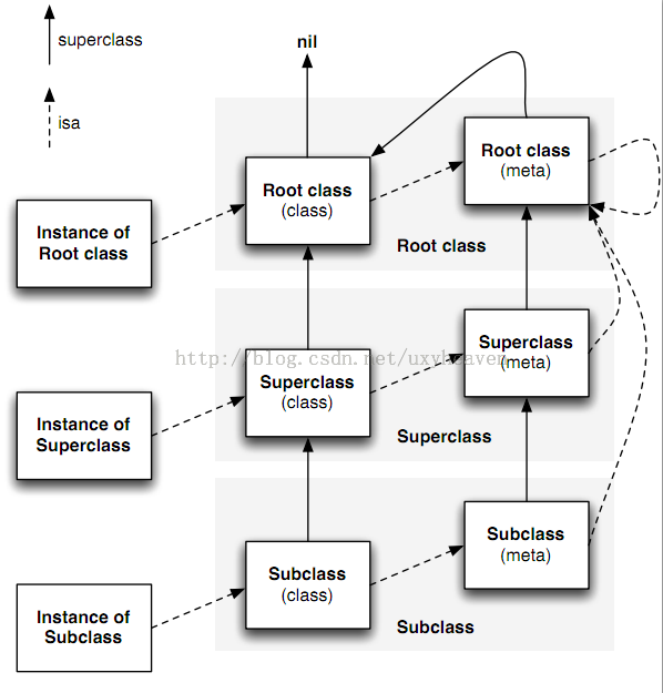 在Objective-C中,任何类的定义都是对象。类和类的实例(对象)没有任何本质上的区别。任何对象都有isa指针。