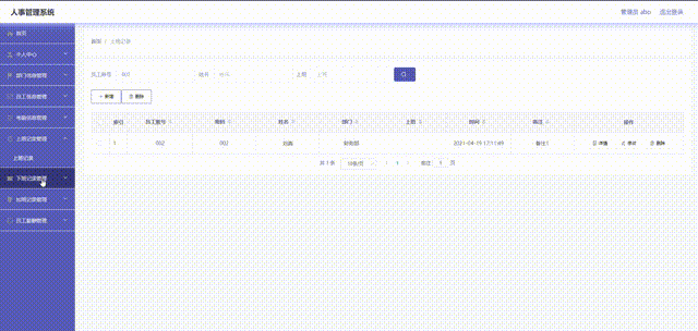 本基于vue的人事系统有管理员和员工两个角色。管理员功能有个人中心,部门信息管理,员工信息管理,考勤信息管理,上班记录管理,下班记录管理,加班记录管理,员工薪酬管理等。员工功能有个人中心,考勤信息管理,上班记录管理,下班记录管理,加班记录管理,员工薪酬管理等。因而具有一定的实用性。