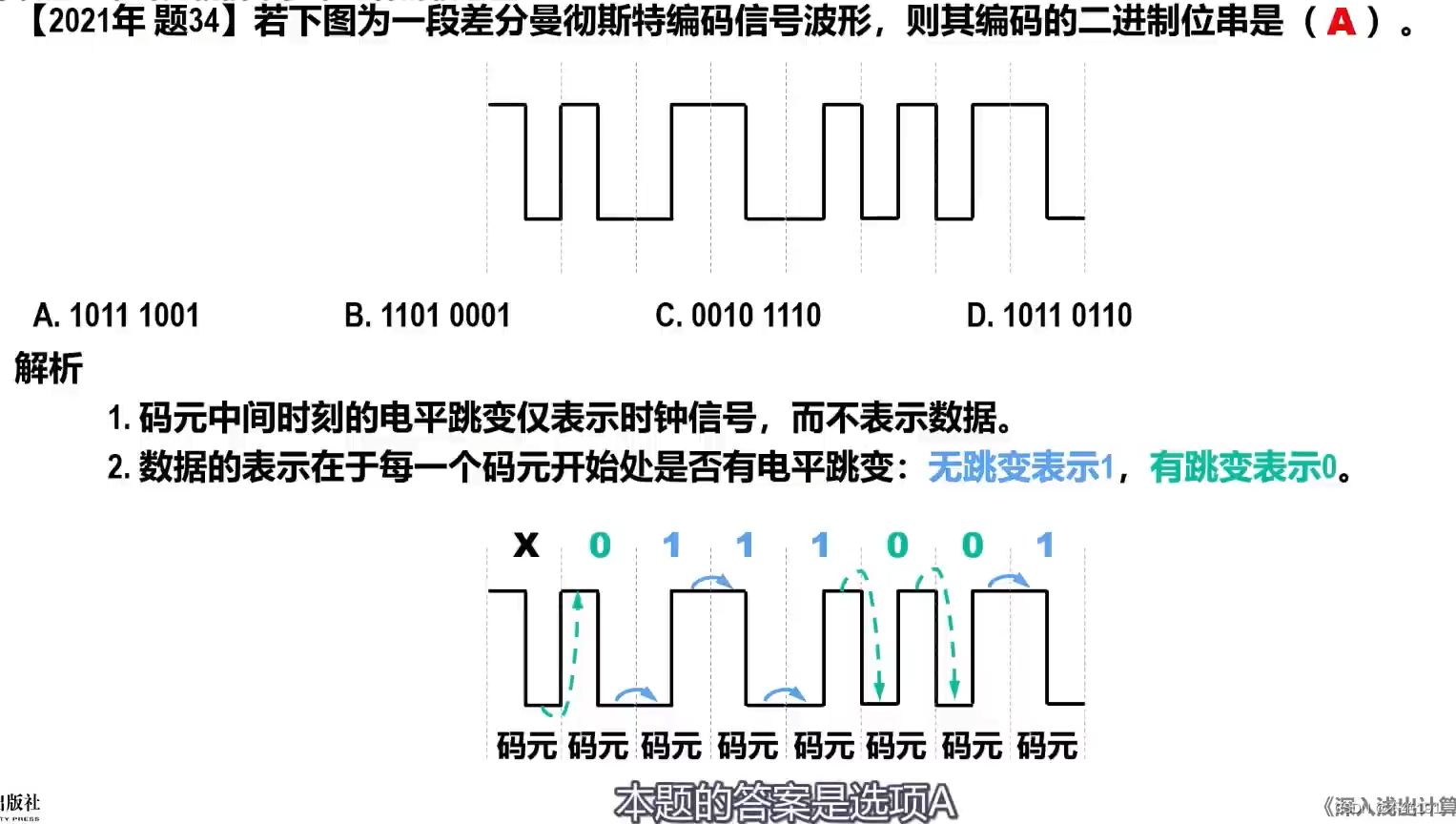 编码方式:若码元为1,则两个码元交接处无跳变;若为零,则两个码元交接处有跳变。