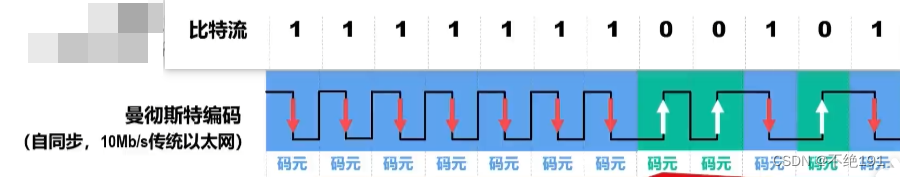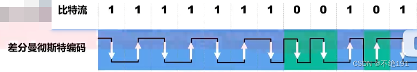 编码方式:单个码元中间下跳为1,单个码元中间上跳为0;也可以反过来定义。
