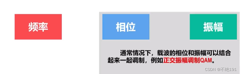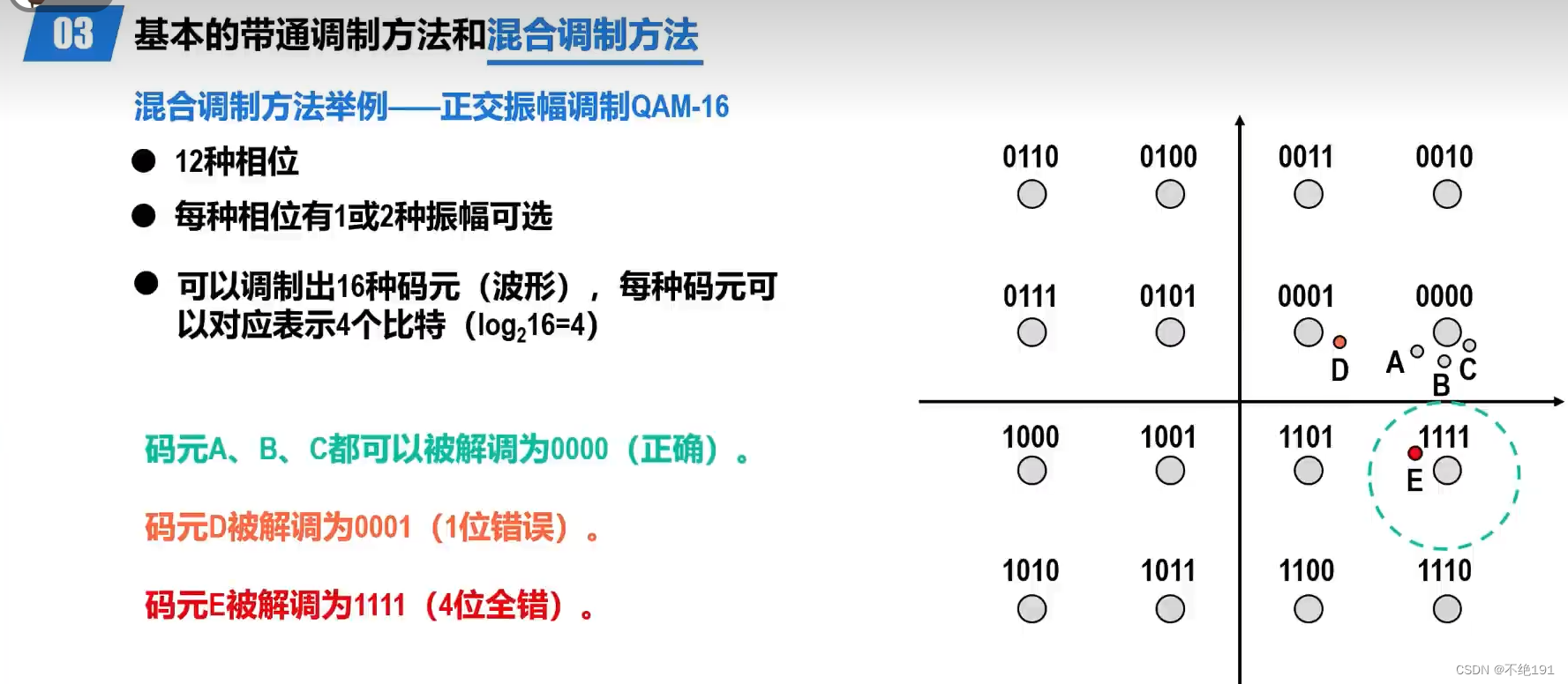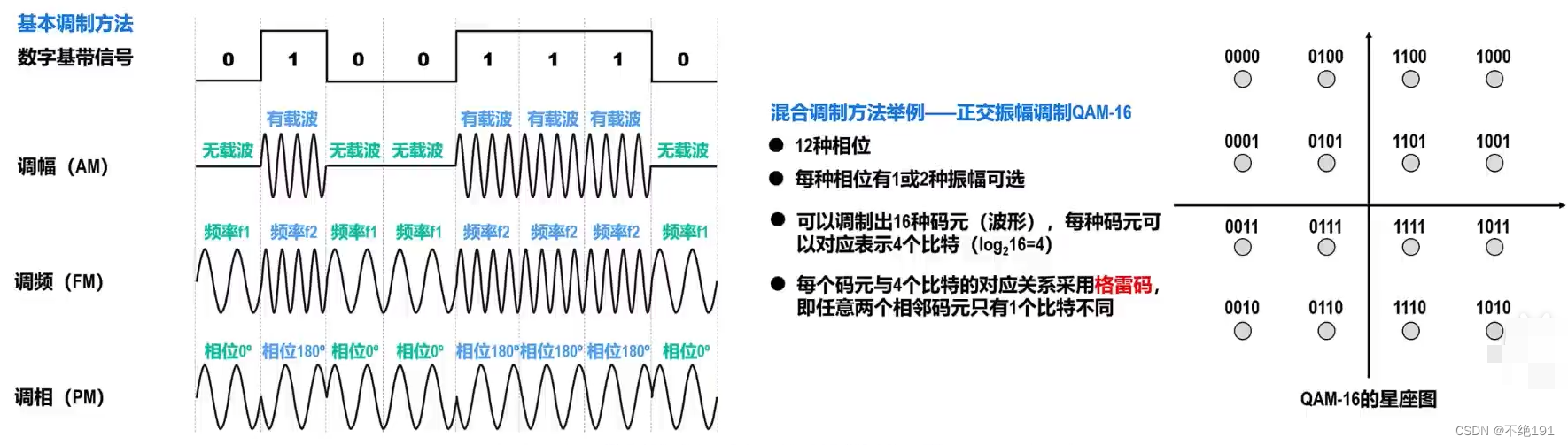 如上图所示,三种基本调制方法所调制的每个码元只能携带1比特的信息量,而正交振幅调制法每个码元可以携带4比特的信息量。