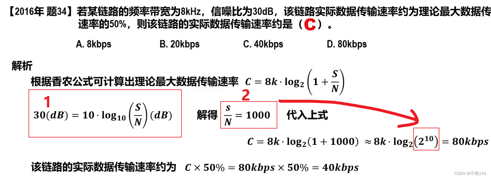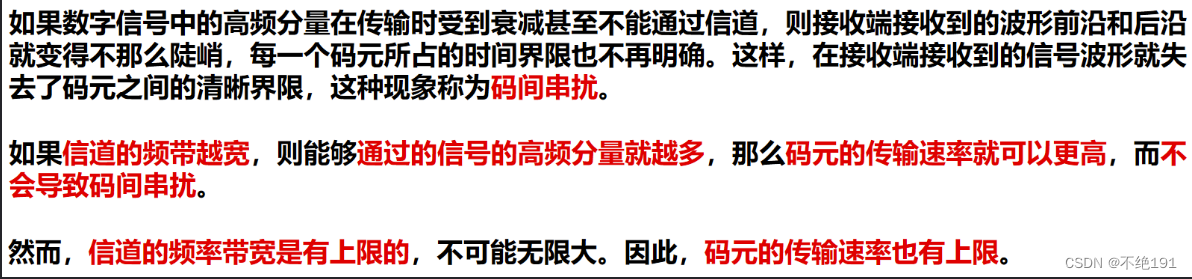 - 使用奈氏准则给出的公式,就可以根据信道的频率带宽,计算出信道的最高码元传输速率。只要码元传输速率不超过根据奈氏准则计算出的上限,就可以避免码间串扰。