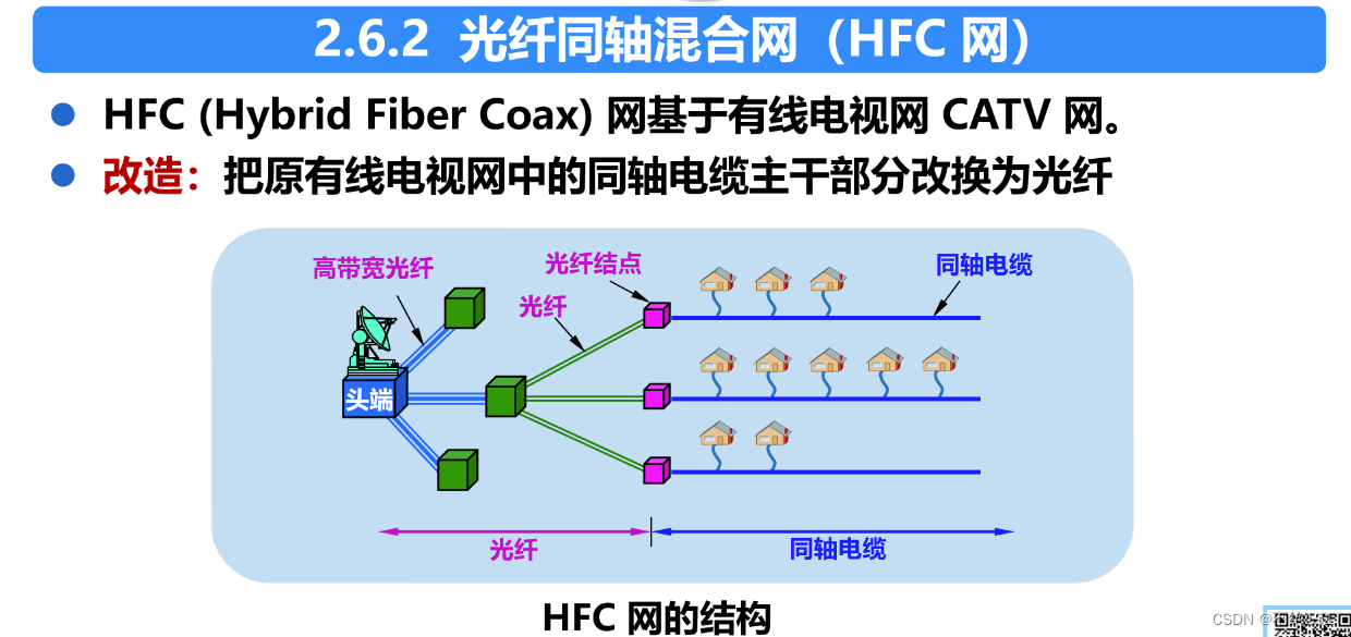为了提高传输的可靠性和电视信号的质量,HFC网把原有线电视网中的同轴电缆主干部分改换为光纤。光纤从头端连接到光纤节点。在光纤节点光信号被转换为电信号,然后通过同轴电缆传送到每个用户家庭。