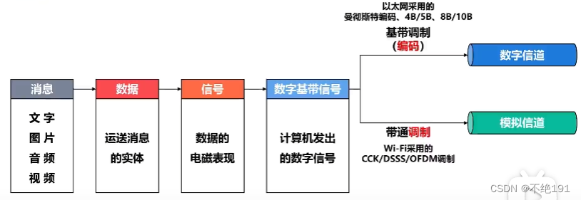 - 数字信号:又称离散信号,代表消息的参数取值是离散的;代表不同离散数值的基本波形就称为码元。