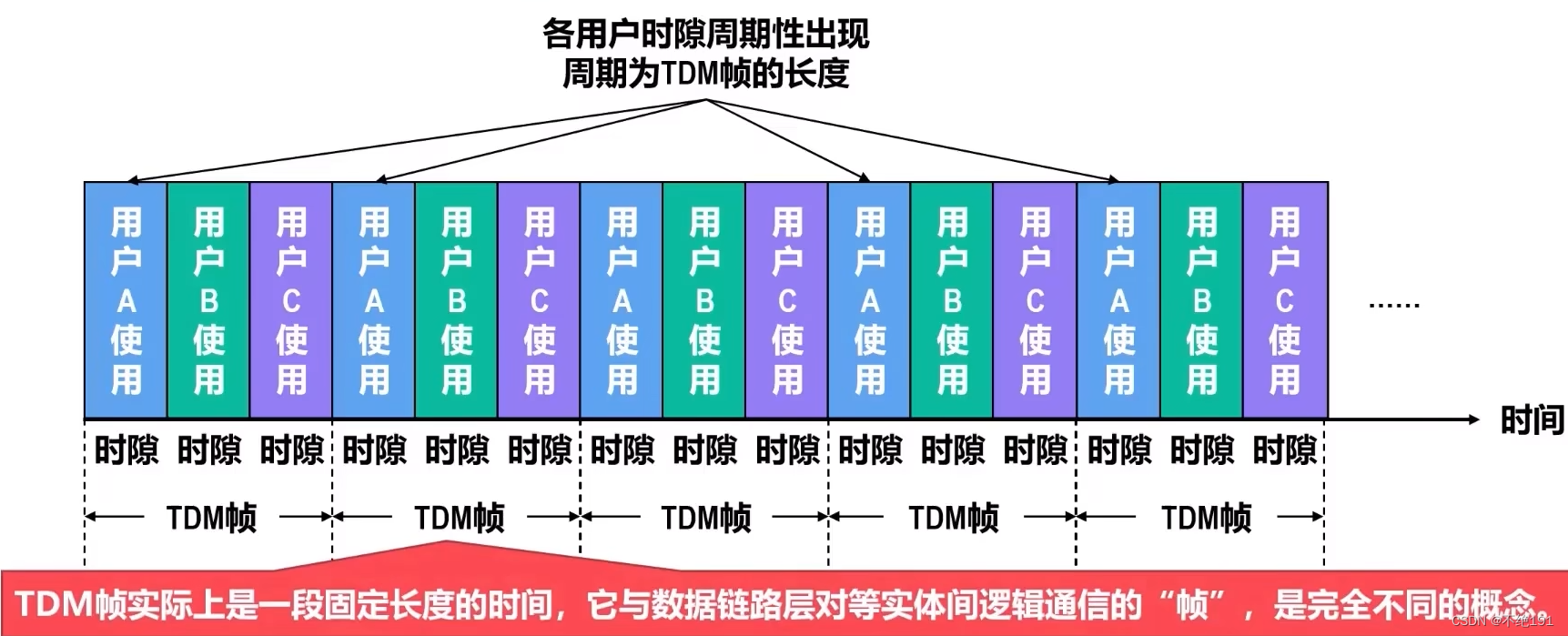 将时间划分为一段段等长的时隙,每一个时分复用的用户,在其相应时隙内独占传输媒体的资源进行通信。时分复用的各用户所对应的时隙,就构成了时分复用帧,即TDM帧
