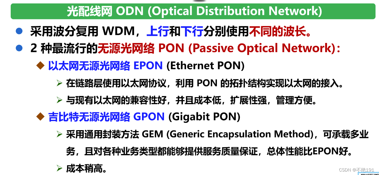 无源光配线网常称为无源光网络PON ,“无源”表明在光配线网无需配备电源,因此基本上不用维护,长期运营成本和管理成本都很低。