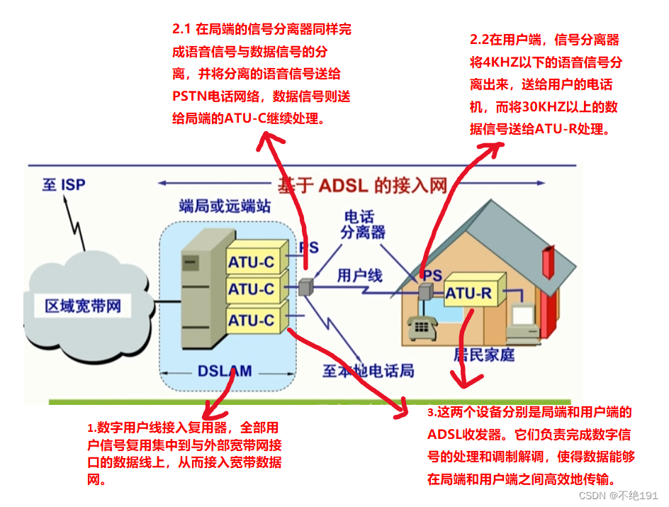 ADSL:是目前应用最广泛的xDSL技术,它利用频分复用技术把普通的电话线分成了电话、上行和下行三个相对独立的信道,从而避免了相互之间的干扰。其中,上行信道传输速率较低,用于发送数据;下行信道传输速率较高,用于接收数据。
