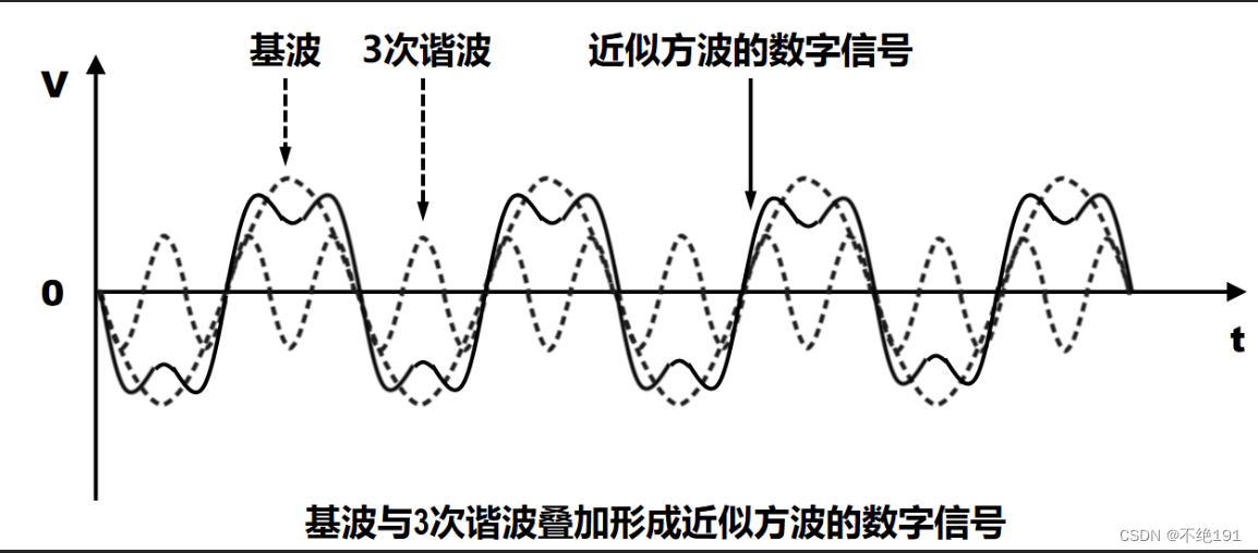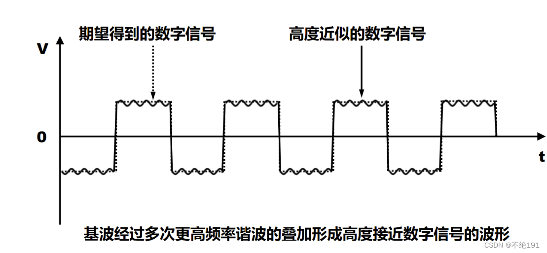 可见,基波经过更高频率的谐波的叠加,就能形成高度接近数字信号的波形