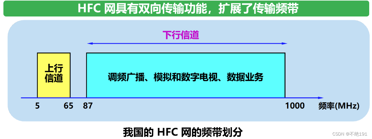 原来的有线电视网的最高传输频率是450 MHz,并且仅用于电视信号的下行传输。但现在的 HFC 网具有双向传输功能,而且扩展了传输频带。目前我国HFC网的频带划分如上图所示