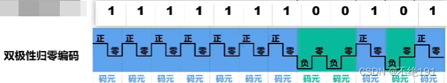 编码特点:在每个码元的中间时刻信号都会回归到零电平。接收方只要在信号归零后采样即可。