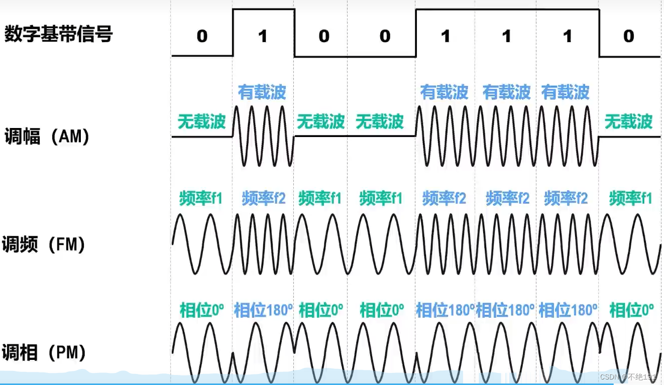调幅:载波的振幅随基带数字信号而变化;无载波为0,有载波为1