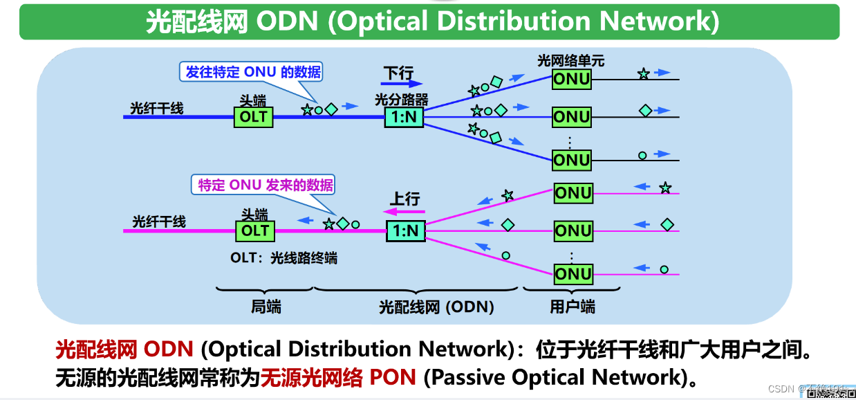 光配线网ODN是光纤接入网中设置在光线路终端(OLT)和光网络单元(ONU)之间的线路和设备的总称。