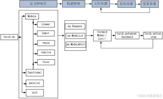 ③  继承nn.Module基类构建模型,又使用相关模型容器(nn.Sequential,nn.ModuleList,nn.ModuleDict等)进行封装。