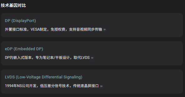 - 特点:引脚少、带宽高,支持 2K/4K 大屏。