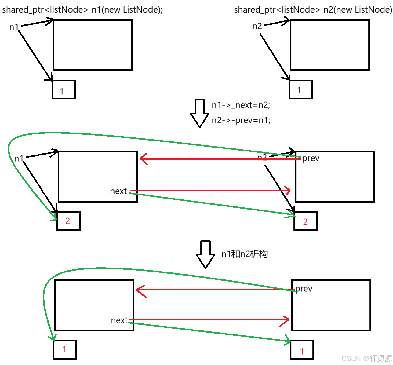 4>.把ListNode结构体中的_next和_prev改成weak_ptr,weak_ptr绑定到shared_ptr时不会增加它的引⽤计数,_next和_prev不参与资源释放管理逻辑,就成功打破了循环引⽤,解决了这⾥的问题。