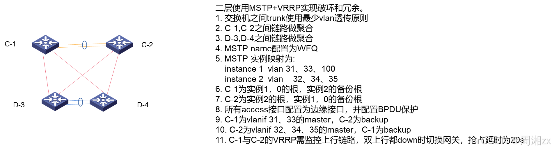 MSTP(多生成树协议):用于破除环路并实现冗余。不同区域配置不同的MSTP实例和根桥,例如: