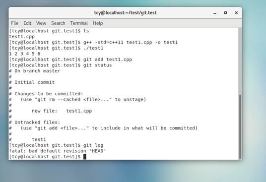 git status输出:这是仓库的首次提交,test1.cpp已被暂存,等待提交。