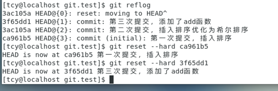 已知目前在第二版本,显示“3ac105a”,与第二版本的版本号对应,如果想回到第一次或者第三次提交,使用命令:git reset --hard 版本号,比如通过这个命令回到第一次,再直接从第一个版本移动到第三个版本,如下图所示。