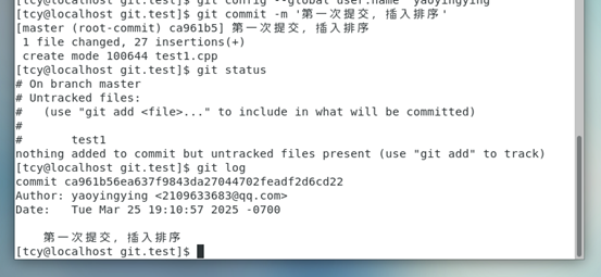 使用命令:git add test1.cpp(git add .可以添加当前的所有文件),如果添加成功是没有任何提示的,可以通过查看状态(git status)和日志报表(git log),(git status可以显示当前所在的分支,工作目录和暂存区中文件的状态,比如哪些是未跟踪、已修改、已暂存的。git log是查看提交历史记录,包括每次提交的作者、日期、提交说明,git log -p可以显示每次提交的具体代码改动),执行过程如下图所示。