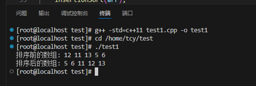 内容是插入排序,完成了编译并且运行成功。(注意有时候代码会使用C++11及以后版本,就可以通过命令:g++ -std=c++11 test1.cpp -o test1,来完成编译)