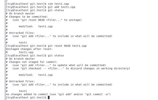 如果代码已经从工作区提交到了暂存区,发现存在问题,就不能往本地仓库提交了,需要从暂存区撤销,需要使用命令:git reset HEAD test1.cpp,如下图所示,“Changes to be committed”说明待提交更改,已经暂存成功,使用了上述命令之后,“Unstaged changes after reset”表明文件回到了未暂存但已修改的状态,用git status查询状态之后,提示文件处于未暂存更改状态,也就是撤销成功