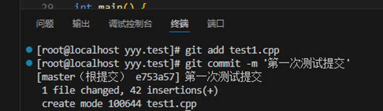 5.使用命令git add test1.cpp将代码提交到暂存区,git commit -m '备注'将代码提交到本地仓库中,如下图所示