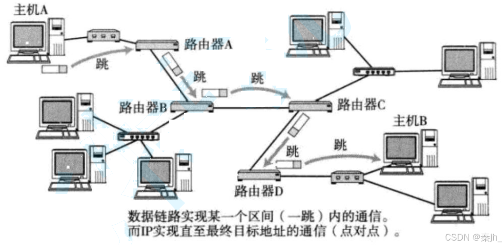 所谓 "一跳" 就是数据链路层中的一个区间. 具体在以太网中指从源MAC 地址到目的MAC 地址之间的帧传输区间.