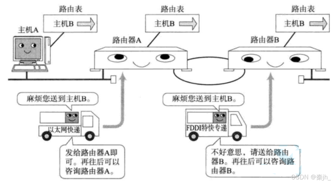 - 路由器决定这个数据包是能直接发送给目标主机, 还是需要发送给下一个路由器;