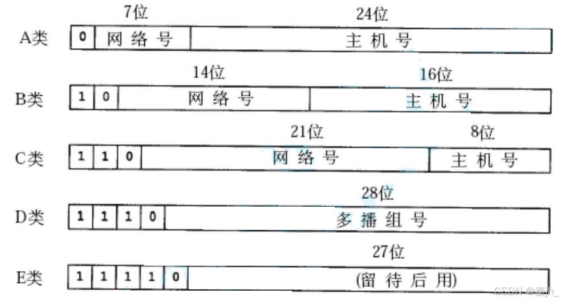 过去曾经提出一种划分网络号和主机号的方案, 把所有 IP 地址分为五类, 如下图所示