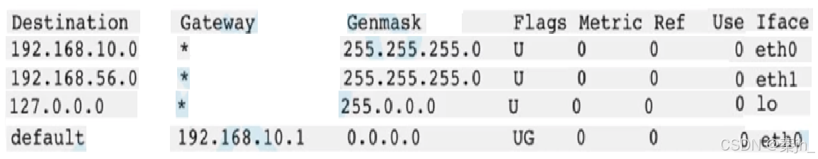 - 路由表的 Destination 是目的网络地址,Genmask 是子网掩码,Gateway 是下一跳地址,Iface 是发送接口,Flags 中的 U 标志表示此条目有效(可以禁用某些条目),G标志表示此条目的下一跳地址是某个路由器的地址,没有 G 标志的条目表示目的网络地址是与本机接口直接相连的网络,不必经路由器转发;
