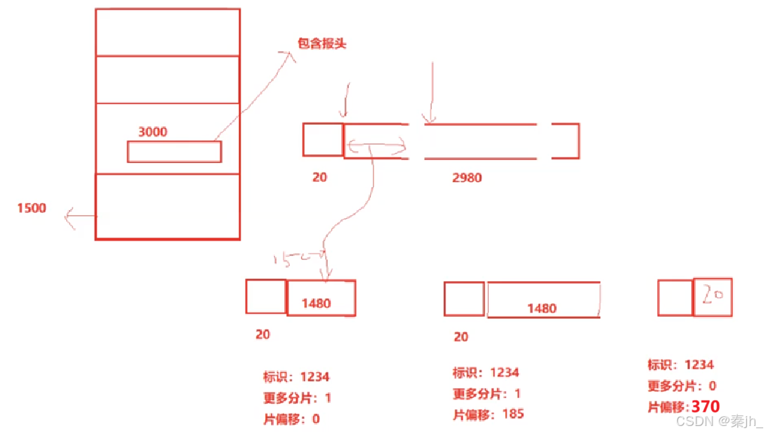 第一片的片偏移是0,第二片的片偏移是1480,第三片就是1480+1480==2960。计算片偏移的时候,不能包含任何一片的报头,他要计算的是原始有效载荷的片偏移量。