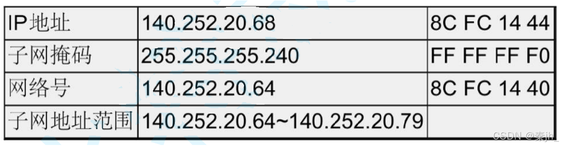 IP 地址和子网掩码还有一种更简洁的表示方法,例如 140.252.20.68/24,表示IP地址为140.252.20.68, 子网掩码的高 24 位是 1,也就是 255.255.255.0