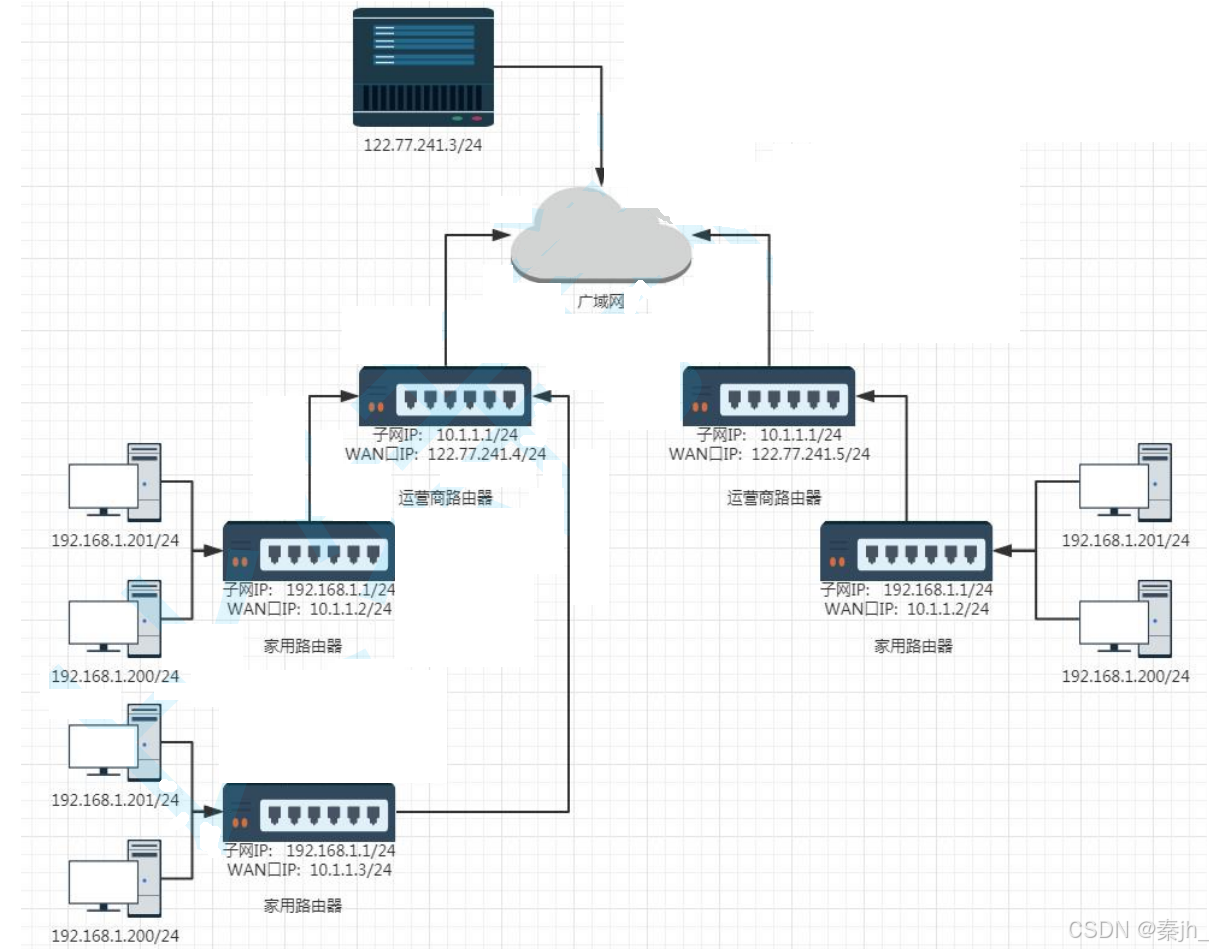 - 每一个家用路由器, 其实又作为运营商路由器的子网中的一个节点. 这样的运营商路由器可能会有很多级, 最外层的运营商路由器, WAN 口 IP 就是一个公网IP了.
