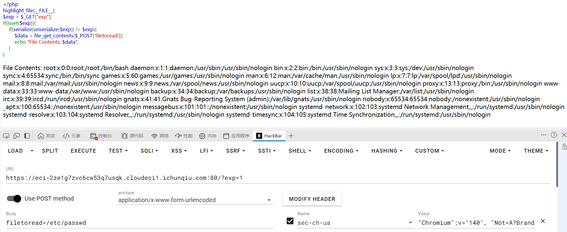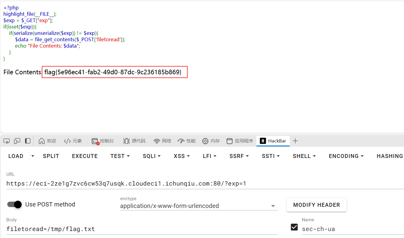 要先满足 serialize(unserialize($exp)) != $exp 才可以用 file_get_contents 读取文件。一开始exp还弄得很长,但其实很简单,输入个1就可以,1 并不是合法的序列化格式,unserialize("1") 返回 false 并且会触发一个警告,但是 PHP 的 serialize(false) 会返回字符串 "b:0;",和输入 "1" 不同,因此条件成立