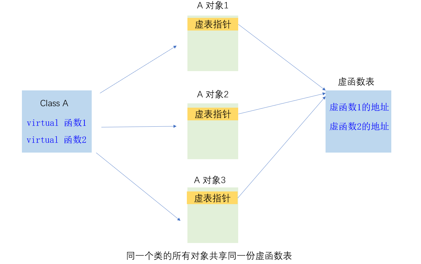 这种机制使得不同派生类可以重写基类的虚函数,而基类指针 / 引用无需修改就能调用到正确的派生类实现,体现了 "一个接口,多种实现" 的多态思想。