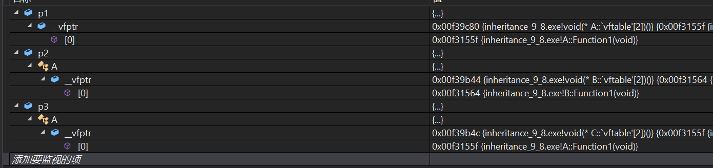 //派生类C不重写A中的虚函数,虚函数表中Function1的地址与A相同