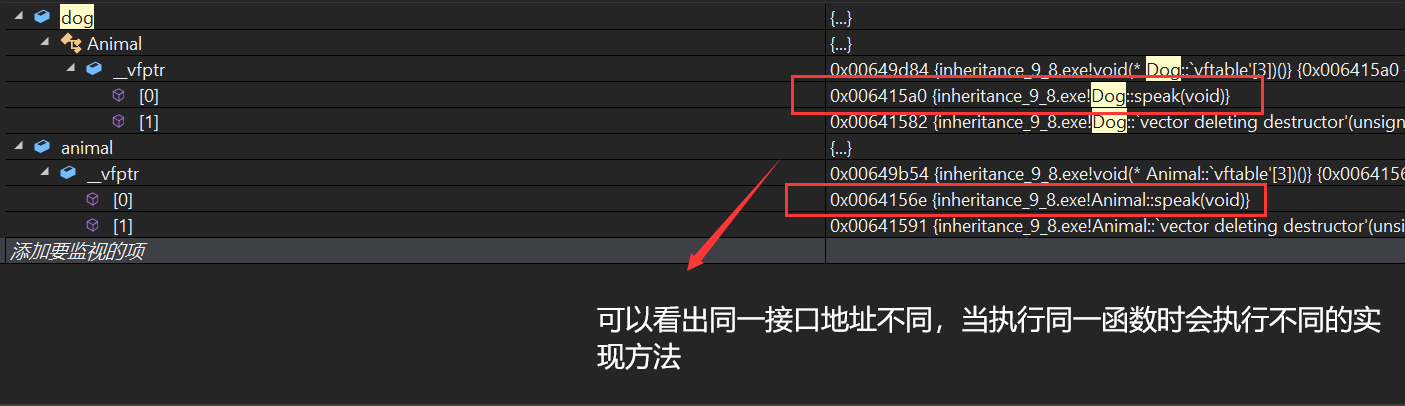 在这个例子中我们首先看到在makeSound接口中基类的指针都调用了speak。此时编译器在运行的时候会检查基类指针animal的指向,如果指向Animal类型会在该类型对象中查找虚表指针找到虚函数表并将其中的speak函数地址放入指定寄存器并执行函数。因为Dog中重写了speak接口,在虚函数表中speak接口的地址会被重写后的函数地址覆盖,此时虽然接口与Animal相同但执行了不同的实现方法,这就是多态。
