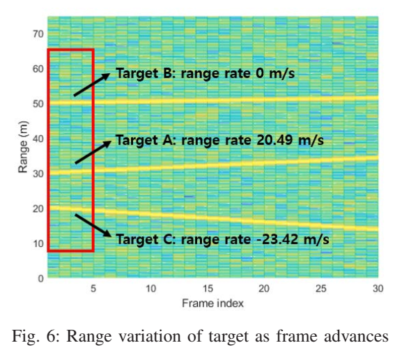图6描述:图6展示了三个目标的距离随帧索引变化的情况。横轴是帧索引(0-30),纵轴是距离(10-70 m)。图中可以清晰看到三条具有不同斜率的轨迹:目标A的轨迹(斜率为正,约20.49 m/s)表明目标远离雷达;目标B的轨迹(几乎水平,0 m/s)表明目标静止;目标C的轨迹(斜率为负,约-23.42 m/s)表明目标接近雷达。这些斜率提供了无模糊但精度较低的速度估计。