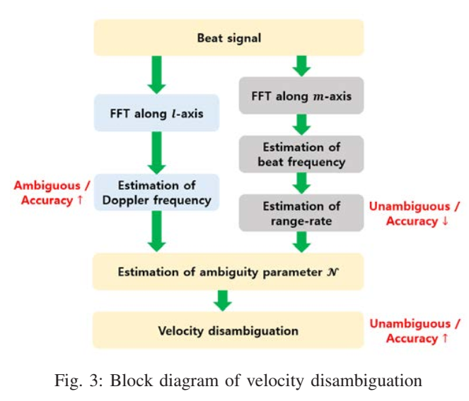 图3描述:图3展示了提出的速度消歧方法的完整框架。系统输入是差拍信号,经过两条并行的处理路径。左侧路径(标记为"Ambiguous/Accuracy↑")通过FFT沿lll轴提取多普勒频率,得到高精度但存在模糊的速度估计v^\hat{v}v^。右侧路径(标记为"Unambiguous/Accuracy↓")通过FFT沿mmm轴提取多帧的距离信息,然后估计距离变化率,得到无模糊但精度较低的速度估计v˙\dot{v}v˙。最后,这两个估计值被送入模糊参数估计模块,确定NNN值并实现速度消歧,输出无模糊且高精度的速度估计。