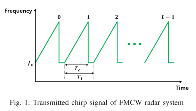 图1描述:图1展示了FMCW雷达系统的发射啁啾信号示意图。横轴表示时间,纵轴表示频率。可以看到频率随时间线性增加,形成锯齿波形状。在一个完整的帧周期TfT_fTf内,连续发射LLL个啁啾脉冲(图中显示为0到L−1L-1L−1),每个啁啾之间的间隔为TlT_lTl。这种重复的线性调频信号构成了FMCW雷达的基本发射波形。