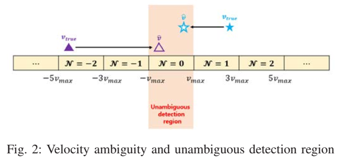 图2描述:图2形象地展示了速度模糊现象和无模糊检测区域。图中央的橙色区域表示无模糊检测区域[−vmax,vmax][-v_{max}, v_{max}][−vmax,vmax]。当真实速度vtruev_{true}vtrue(用蓝色星号标记)超出这个区域时,由于相位的2π2\pi2π周期性,它会被错误地映射到无模糊区域内的某个位置v^\hat{v}v^(用红色圆圈标记)。图中展示了不同的模糊区域,用N=−2,−1,0,1,2,…N = -2, -1, 0, 1, 2, \ldotsN=−2,−1,0,1,2,…标记,每个区域的宽度为2vmax2v_{max}2vmax。