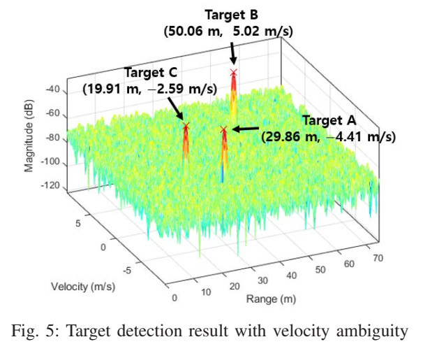 通过计算,三个目标的模糊参数NNN被正确估计为1、0和-2,最终重建的无模糊速度分别为15.06 m/s、5.02 m/s和-22.05 m/s,与真实值高度吻合。