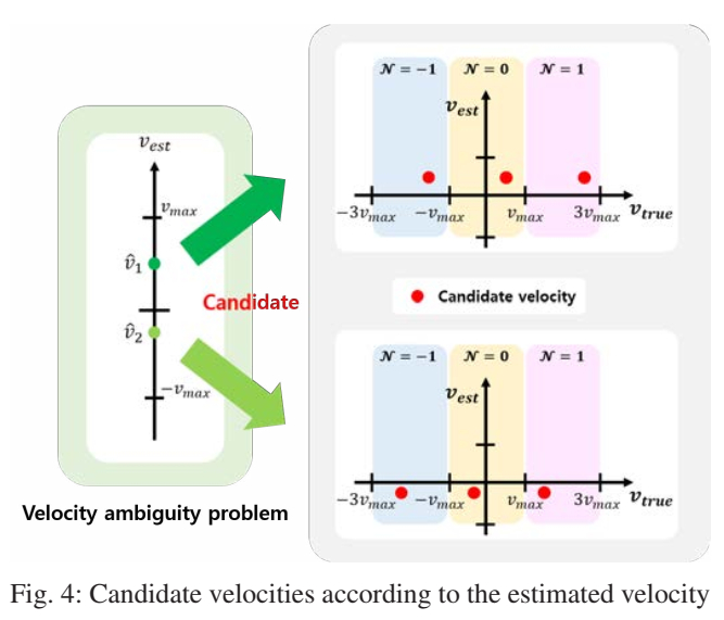 图4描述:图4说明了根据估计速度确定候选速度的过程。中心显示了估计得到的模糊速度v^\hat{v}v^。根据不同的模糊参数NNN值(N=−1,0,1N = -1, 0, 1N=−1,0,1等),存在多个候选真实速度,它们分布在不同的模糊区域中。每个候选速度与估计速度的关系为vcandidate=v^+N×2vmaxv_{candidate} = \hat{v} + N \times 2v_{max}vcandidate=v^+N×2vmax。图中用不同颜色的区域表示不同的模糊区间,红色点表示各个候选速度的位置。
