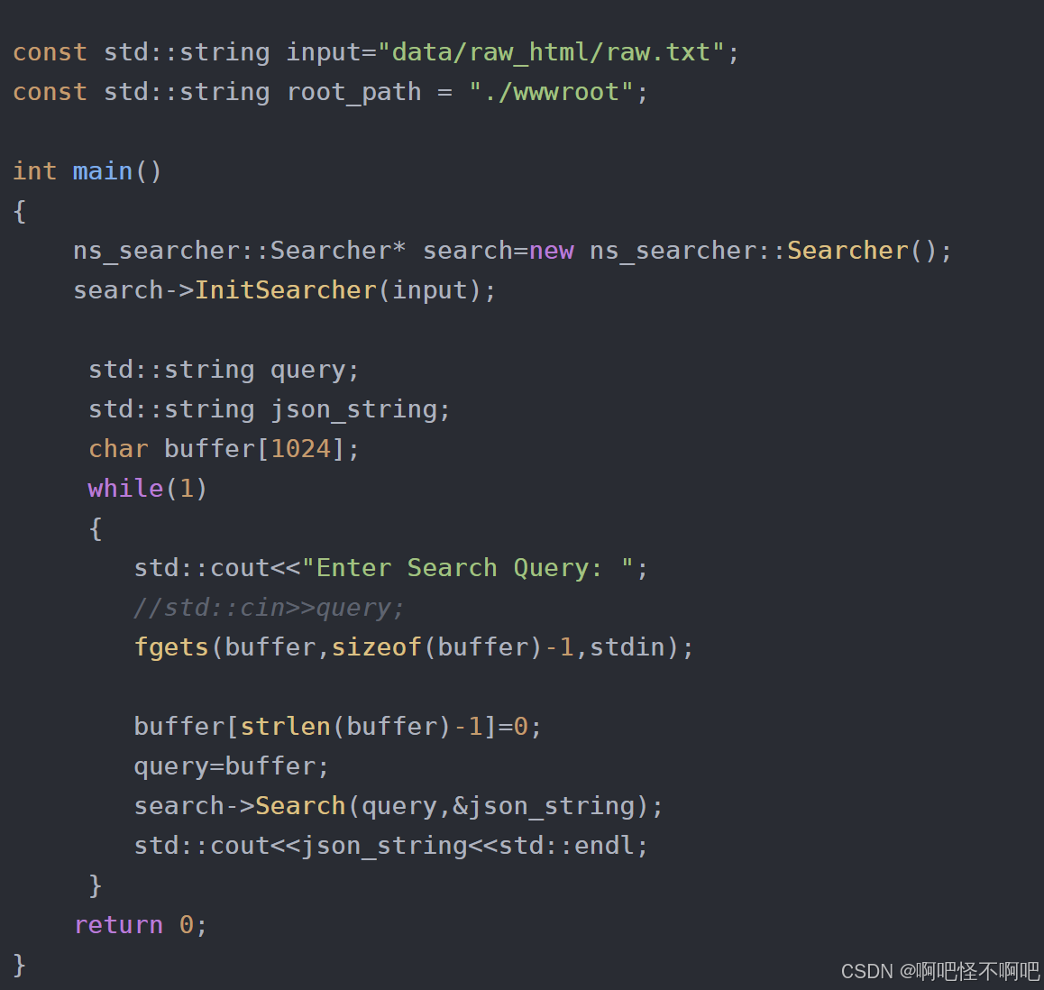 buffer[strlen(buffer)-1]=0;是因为用户在输入的时候会有换行符,我们要去掉这个。然后把处理后的结果交给query,然后调用Search函数,把经过处理后的结果交给json_string,然后输出。