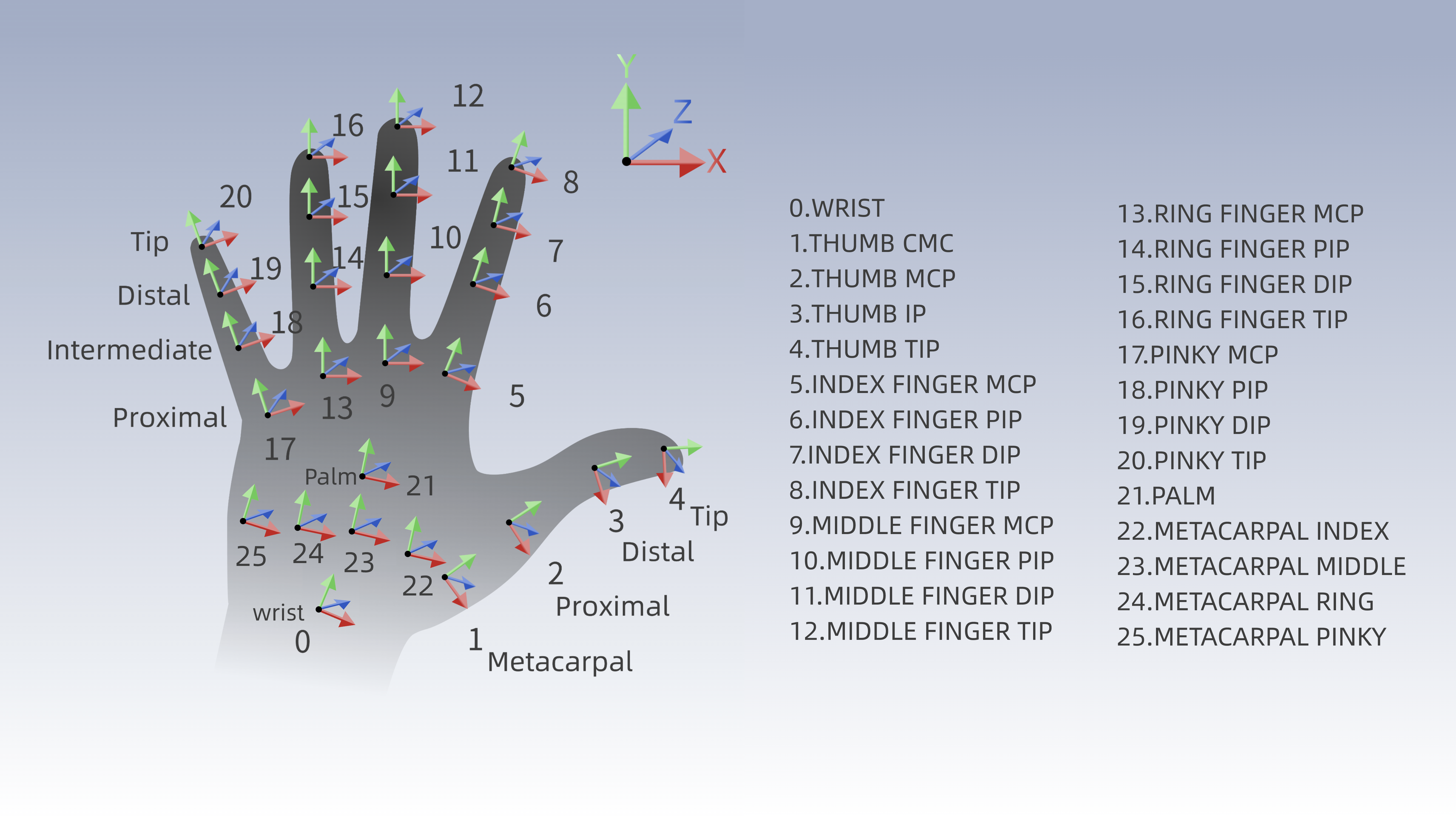 26个节点,分别是手腕WRIST,掌心PALM,4个掌骨(METACARPAL)节点,和5根手指关节节点,拇指从CMC指骨末节依次MCP、IP、TIP指尖,其他从MCP指骨末节依次PIP、DIP、TIP指尖。