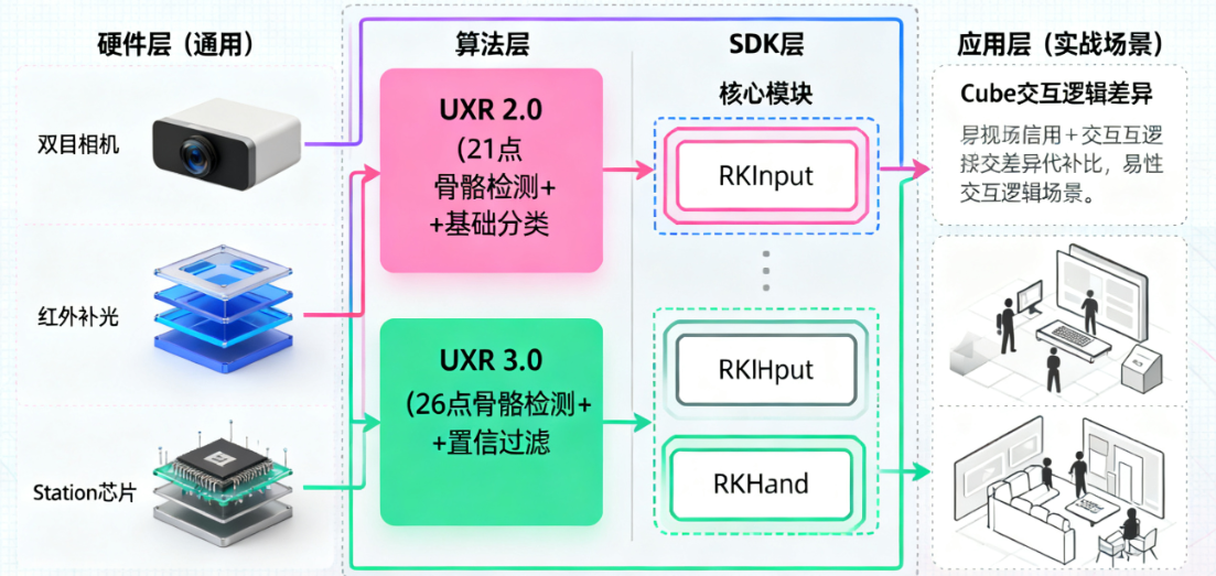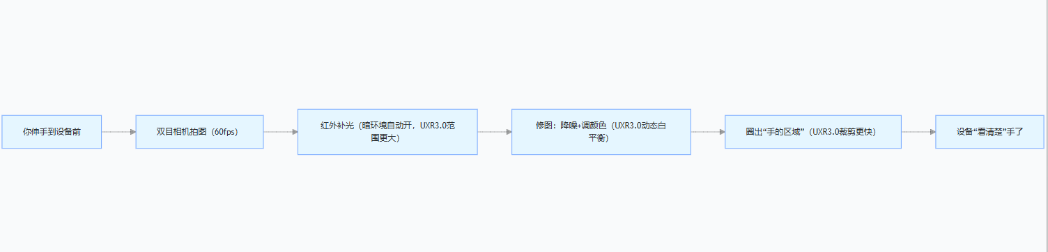 不管是UXR 2.0还是3.0,手势识别的核心逻辑都是“看得到手→认得出手势→跟得上手”,但3.0在每个阶段都做了优化。咱们一步步拆,全程不用复杂术语。