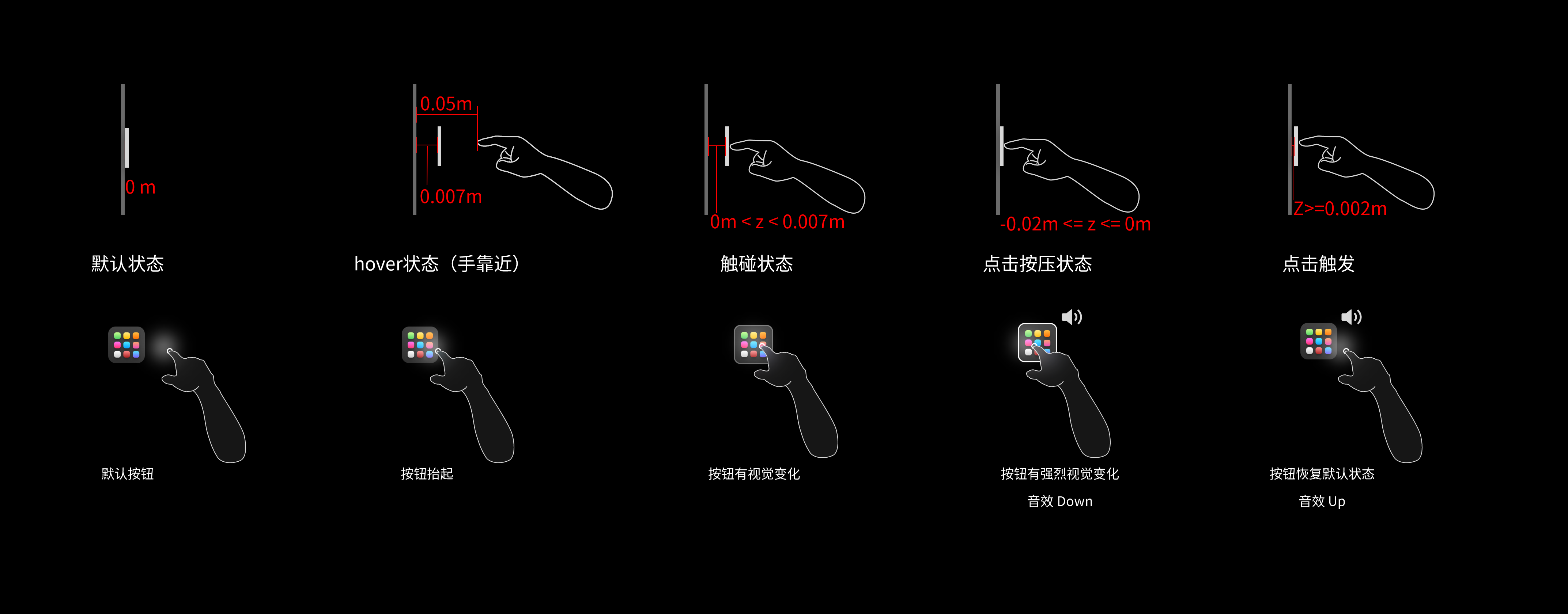 在 UI 操作上Rokid 通过 “近→触→压→抬” 四阶段交互反馈实现:默认时 UI 保持静止;手靠近进入 hover 状态,按钮向上抬动 “预告交互”;手指触摸时,按钮微变色、微缩放;按压到底,按钮高亮放大且触发 “Down” 音效;手抬起,按钮复原,“Up” 音效响起,完成点击。